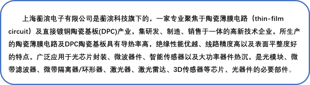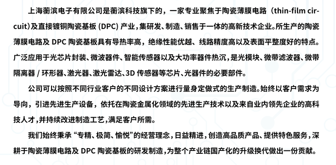 上海蘅濱電子有限公司是蘅濱科技旗下一家專業(yè)聚焦陶瓷薄膜電路(thin-film)及DPC直接鍍銅陶瓷基板產(chǎn)業(yè),集研發(fā)、制造、銷售于一體的高新技術(shù)企業(yè)。所生產(chǎn)的陶瓷薄膜電路廣泛應(yīng)用于光通信芯片的carrier, EML激光器的submount,濾波器、放大器組件等等。DPC陶瓷基板被廣泛應(yīng)用于大功率LED、半導(dǎo)體激光器、VCSEL等領(lǐng)域。